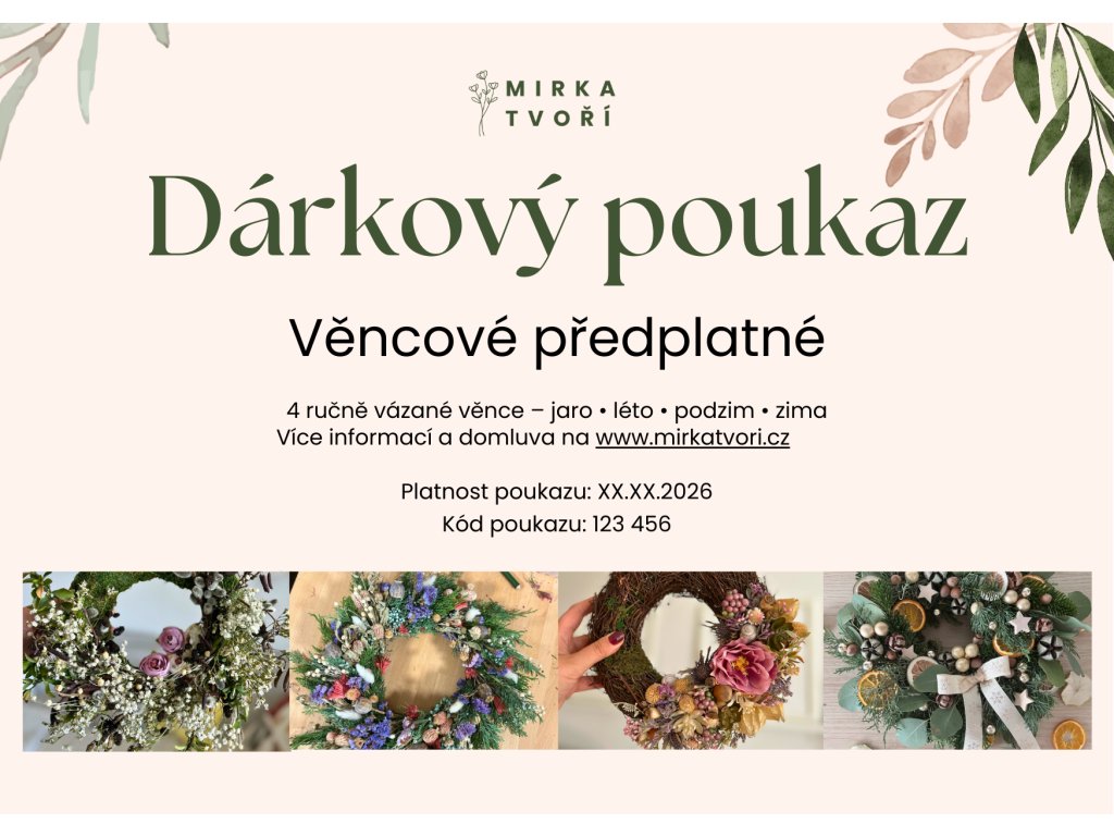 Každý věnec má průměr přibližně 30–40 cm (dle typu sezóny). Každý kus je originální ruční tvorba.